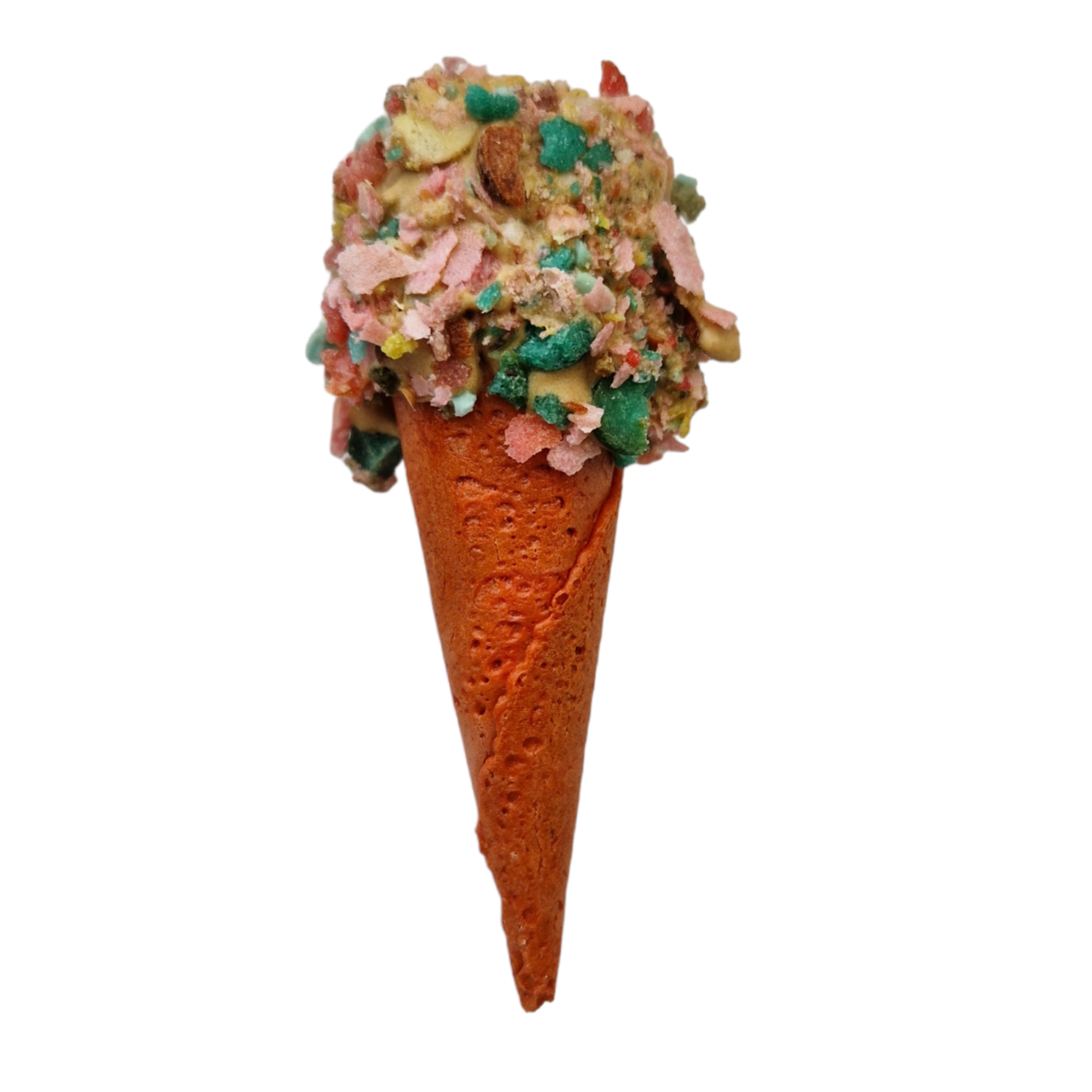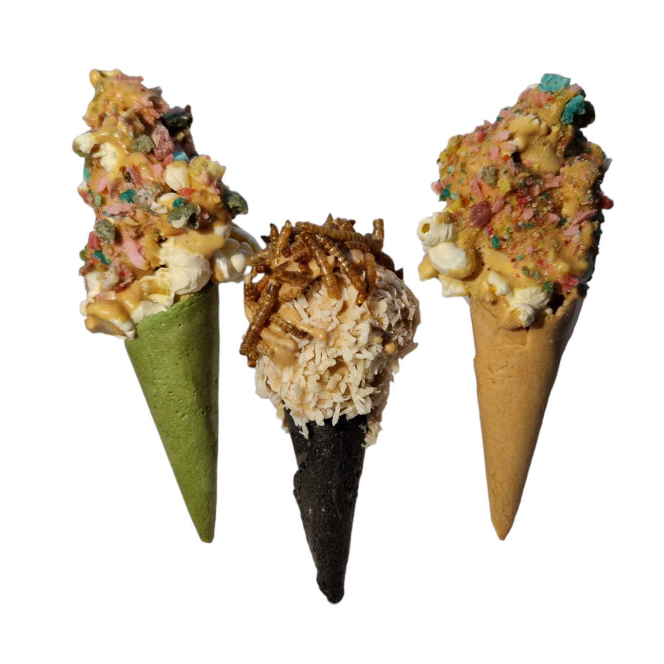 Die Waffeln sind gefüllt mit unseren hausgemachten Trockenfutterdrops. Anschließend mit Popcorn und Glasur drapiert.