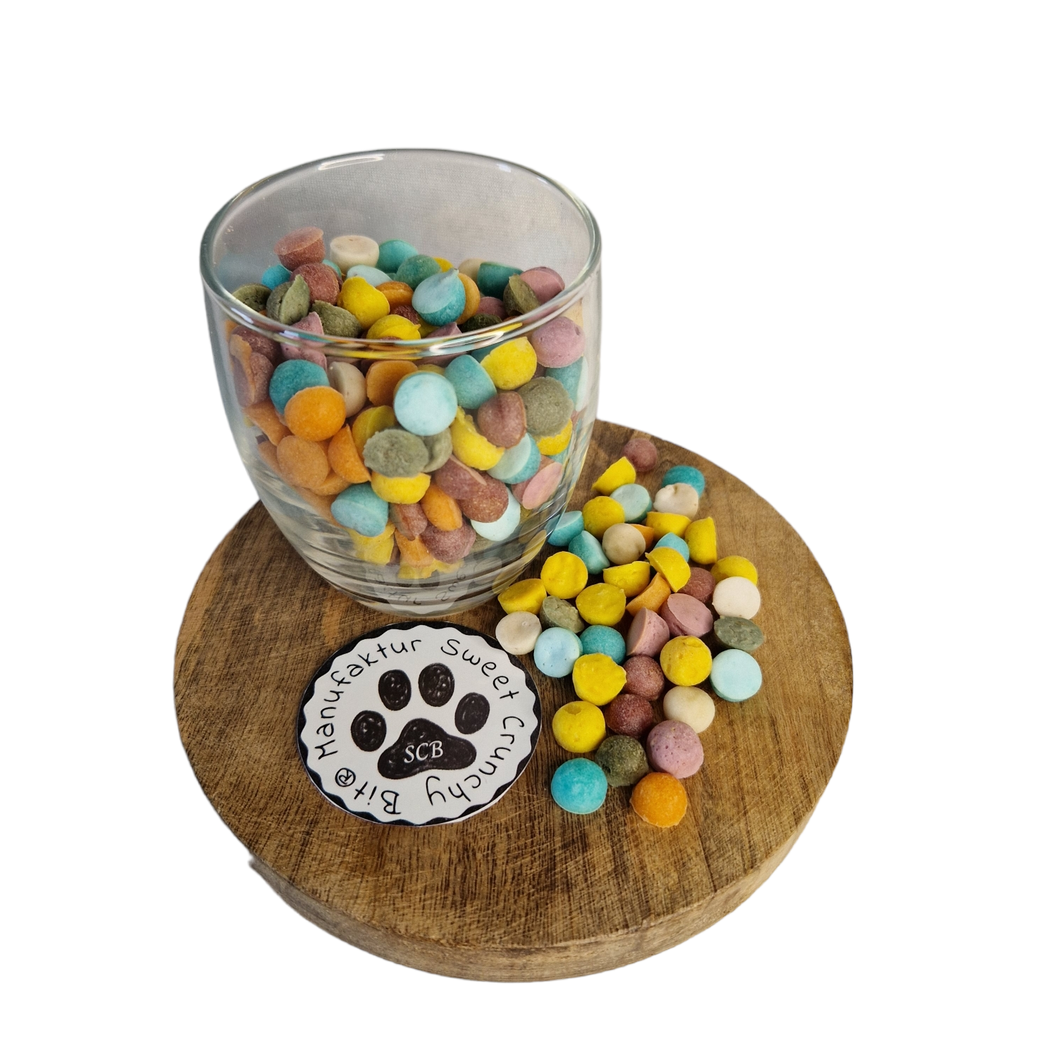 Inhaltsstoffe: Glutenfreie Mehlmischung nach Art des Hauses, Sardinen, Dorschleber, Leberwurst, Entenfond, Büffel, Parmesan, Rote Beete, Algenpulver, Mediterrane Kräutermischung, milde Currymischung, Kokosflocken, Entenfond, Banane, Himbeeren, Wasser, Liebe.